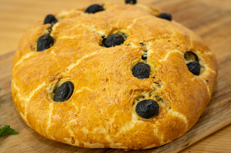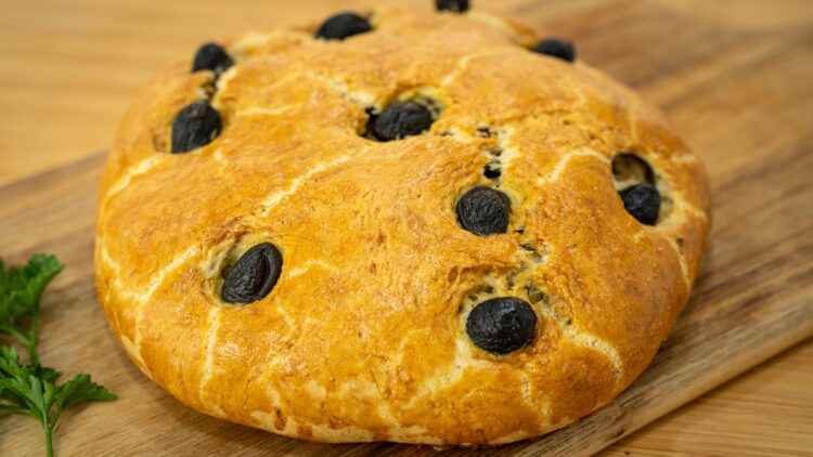 - Decore com algumas azeitonas inteiras e pincele toda a superfície com o ovo batido.